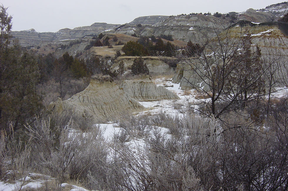 The next morning, we had eggs, bacon, and hash browns. It was somewhat foolish, because I brought a camp stove and meal plan for much warmer weather. This decision would become a problem in the evening. After breakfast, we broke down camp but were unable to dislodge the tent stakes. The Winter freeze held those aluminum stakes in the ground and wouldn't release them, so we left them. While hiking, we crossed over the Little Missouri River and followed the low plain for another hour. When we reached the ascent near Sperati Point, we stopped to assess our options. Ascending the plateau to Sperati Point and the Oxbow Overlook is at least 1000 feet, and then you come back down less than a mile from where we were standing. That route would require at least two hours. Given the frozen conditions, we elected to proceed northeast along the bank of the Little Missouri, anticipating crossing its frozen surface two times to return to the trail. The first crossing was pretty narrow. At the second crossing, we waited while the other crossed. However, it was a success. We resumed the hike eastward. We ascended the plateau near the Riverbend Overlook Trailhead. While climbing the plateau, I reached into the quills of a cactus plant. Those quills would still be in my hand a week after leaving the park. Once our campsite was setup, we went about melting water to drink. All the creeks were frozen, and snow was our only water source. Using the isobutane stove over the next two hours, we melted enough snow for our drinking needs. Shortly afterward it became dark, and we started dinner. Although we were able to have soup, our stove fuel ran out or condensed in the cold weather, denying our attempts at making pizza. At least our drinking needs were taken care of.